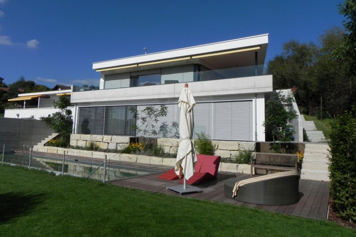 Das Einfamilienhaus am Frickberg mit Hanglage ist südwestlich ausgerichtet und bietet mit raumhohen Fenstern und einer grossen überdachten Terrasse einen erstklassigen Ausblick über das gesamte Tal. Das Gebäude ist nach Minergie®-Standard gebaut und mit einer Luft/Wasser-Wärmepumpe ausgestattet. Das Wohnzimmer und die Küche sind im Erdgeschoss angeordnet, die Schlafzimmer befinden sich im Sockelgeschoss. Auf dem Dach ist eine Solaranlage zur Erwärmung des Poolwassers und als Heizungsunterstützung installiert.