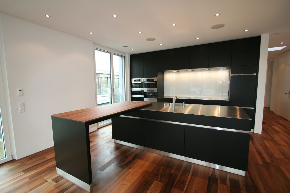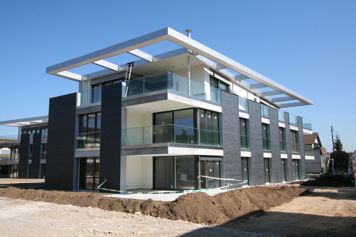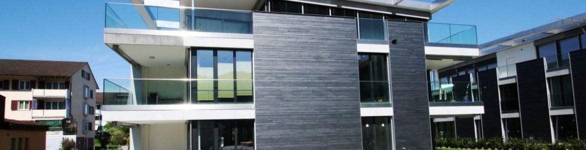 Die Wohnüberbauung Gartenstrasse, umgeben von Einfamilien- und Reihenhäusern, fügt sich mit seiner kleinvolumigen Bauweise von 5 Mehrfamilienhäusern harmonisch in die städtebauliche Umgebung ein. Die versetzte Anordnung der Baukörper schafft ausreichend Platz für Grünräume und einen grosszügigen Gemeinschaftsplatz mit gedecktem Pavillon. Die Anlage ist verkehrsfrei, mit einer zentralen Autoeinstellhalle, konzipiert. Die insgesamt 25 Wohnungen verteilen sich auf 5 Gebäudekuben mit jeweils zwei Voll- und einem Attikageschoss. Pro Regelgeschoss werden zwei grosszügige 2.5- bis 4.5-Zimmer-Wohnungen angelegt. Bei der Materialwahl der Fassade wurde der Schwerpunkt auf Hochwertigkeit und Authentizität gelegt. Das Ergebnis ist ein modern, ehrlich und edel wirkender Mix aus Glas, Stein (Schiefer), Sichtbeton und Aluminium.